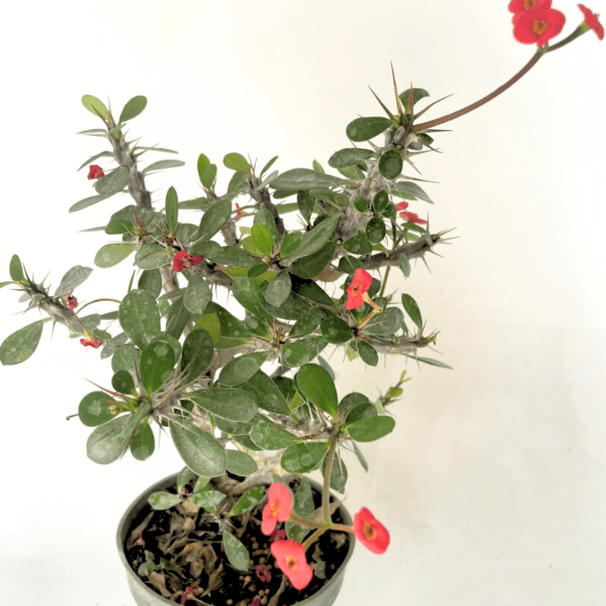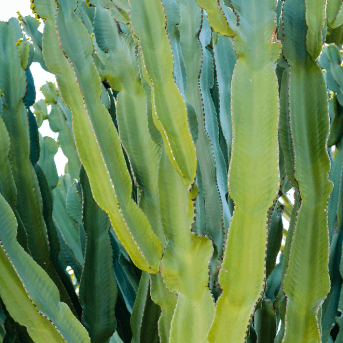 Cathedral Cactus (Euphorbia trigona), African Milk Tree (E. lacteal), Fire Sticks (E. tirucalli), Crown of Thorns (E. Milii), Poinsettia (E. pulcherima)