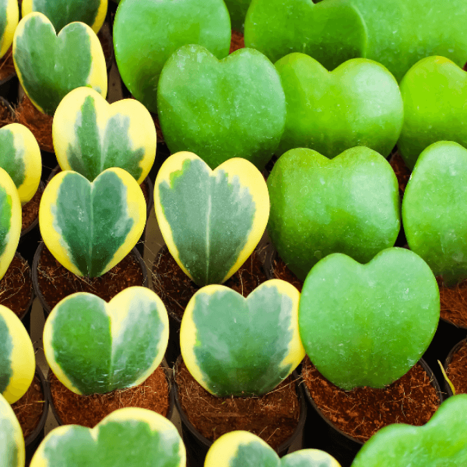 There are so many hoyas on our popularity list! Hoya kerryi has heart-shaped leaves, and the variegated macrophylla has beautiful large leaves. The Hindu rope variety can boast standard green or variegated leaves that start out bright red before turning to a beautiful pink.