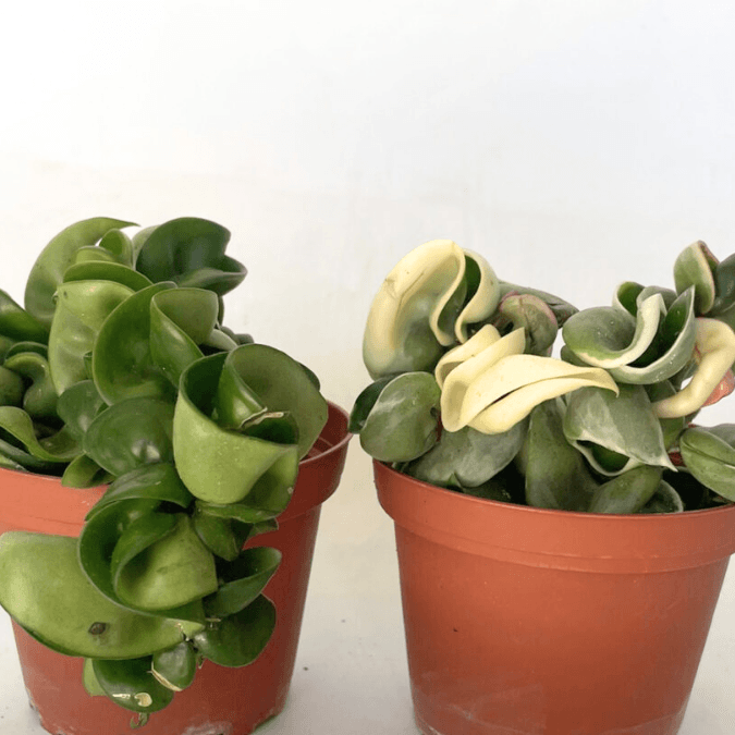Comparison of Hoya Hindu Rope regular and variegated. In the sun, the variegated variety will have a hint of pink.